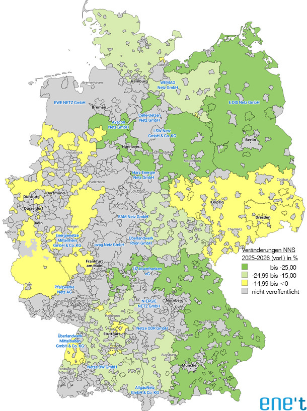 Die Netznutzungsentgelte 2025 sanken gegenüber dem Vorjahr bereits eher unerwartet und deutlich, nachdem Belastungen aus Netzgebieten mit hohem Anteil von EE-Anlagen umverteilt wurden (vgl. Newsletter NNS Nr. 121). Für das Jahr 2026 werden nun erneut deutliche Senkungen erwartet, nachdem die Bundesregierung einen Zuschuss aus dem Bundeshaushalt in Höhe von 6,5 Milliarden Euro zu den Übertragungsnetzentgelten angekündigt hatte (vgl. Newsletter NNS Nr. 122). Da sich die Höchstspannungsnetzentgelte nicht in voller Höhe auf die nachgelagerten Netzebenen übertragen lassen, gab es unterschiedliche Prognosen zur Auswirkung auf die einzelnen Kundengruppen. Für Privathaushalte wurde beispielweise eine Spanne von 1,2−2 ct/kWh erwartet.