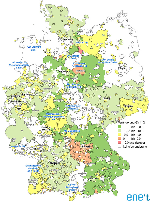 Von den 9.168 erfassten Grundversorgungstarifen zählen 4.688 zum Versorgungsgebiet der E.ON. Der größte Grundversorger der Bundesrepublik vermag es in ausnahmslos allen Postorten, den Kunden eine Entlastung anzubieten. Die Preise bewegen sich hierbei von ‑33,53 Prozent bis ‑9,28 Prozent im Vergleich zum Vorjahr.