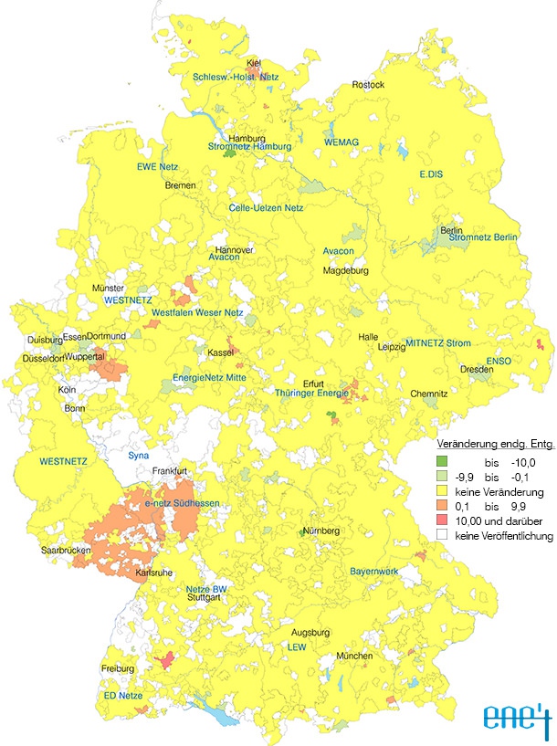 Die stärkste Korrektur der vorläufigen Entgelte hin zu niedrigeren Gebühren nimmt die EnR Energienetze Rudolstadt GmbH in Thüringen vor (-19,58 % auf 4,67 ct/kWh). Starke Senkungen nehmen außerdem die bayerischen Stadtwerke Langenzenn (-10,80 % auf 5,95 ct/kWh) und die Stadtwerke Buxtehude GmbH in Niedersachsen (-10,14 % auf 5,05 ct/kWh) vor. Deutlich höhere endgültige Entgelte haben dagegen die Stadtwerke Niesky GmbH in Sachsen angekündigt, wo die Gebühren um +31,23 % auf 7,73 ct/kWh steigen. Ebenfalls höhere Entgelte müssen Lieferanten in den Netzen der Stadtwerke Bredstedt — Netz GmbH in Schleswig-Holstein (+15,16 % auf 6,99 ct/kWh) und des bayerischen Städtischen Kommunalunternehmens Baiersdorf (+13,59 % auf 6,27 ct/kWh) berücksichtigen.
